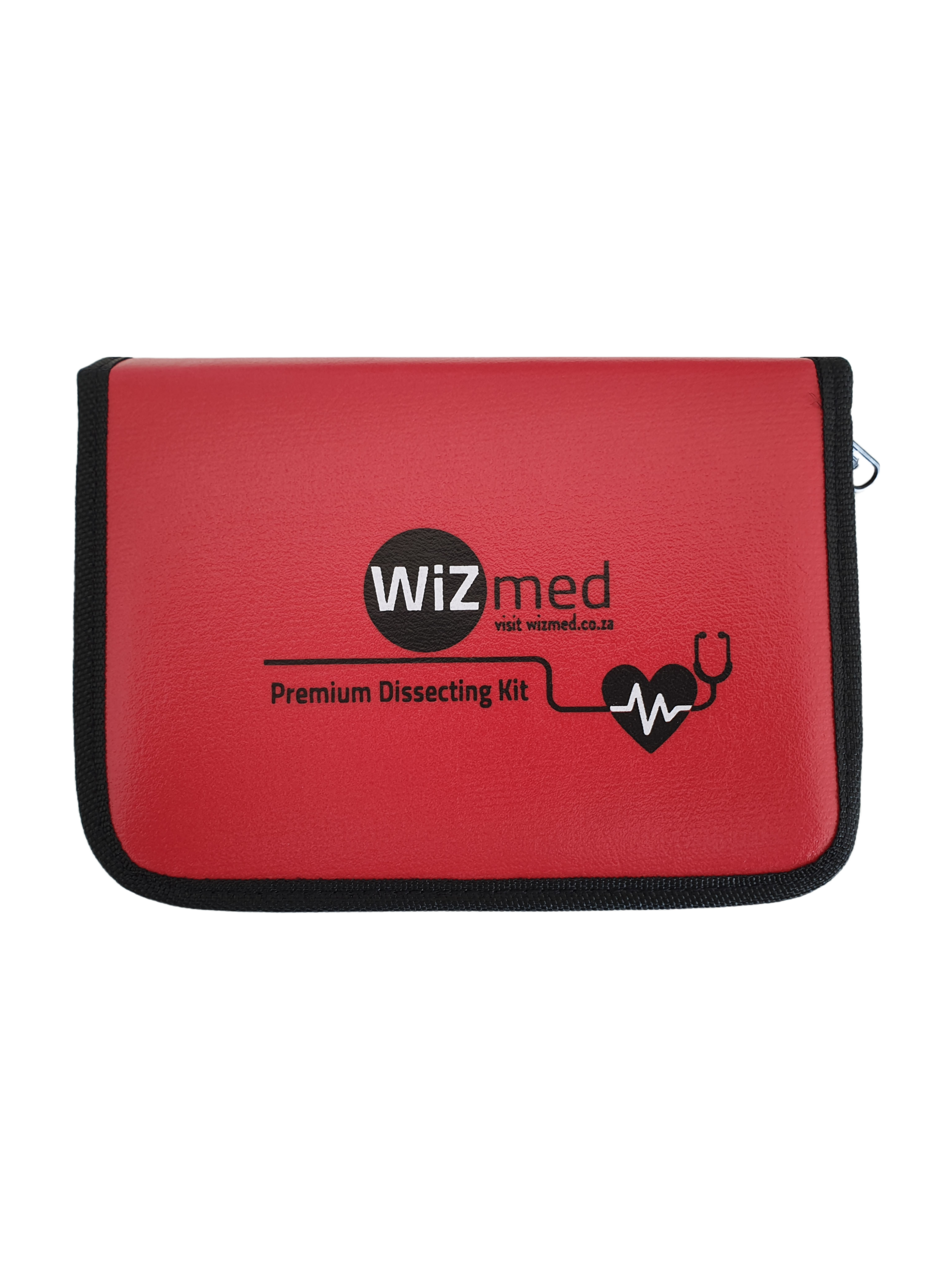 Standard dissecting kit suitable for medical and veterinary students. Encased in a red leatherette cover.