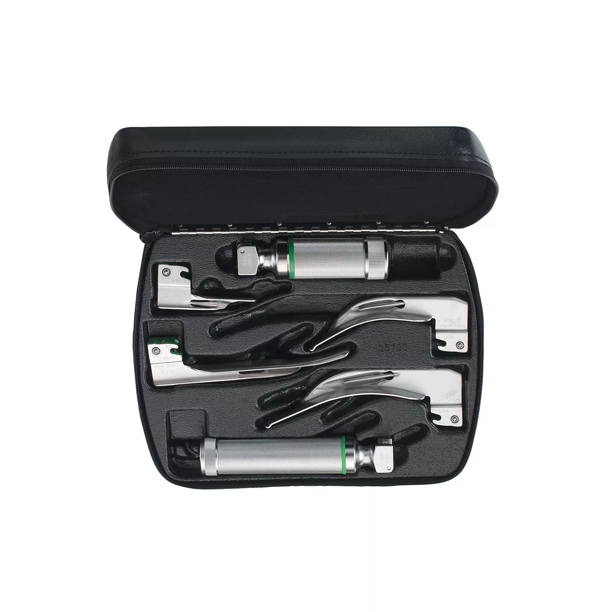 Complete set of Macintosh Laryngoscope Blades with medium and small handles in zipper case. MacIntosh, blade sizes #1, 2, 3, 4