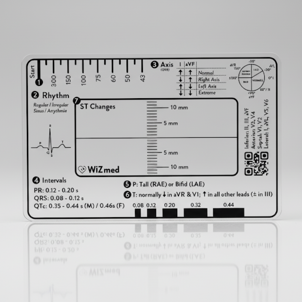 Meet the WiZmed ECG Card: a durable, wipe-clean quick-reference tool that puts rate calculation, axis quadrant, ST-segment mm box, and interval ranges right in your hand—plus a QR code to our step-by-step tutorial.